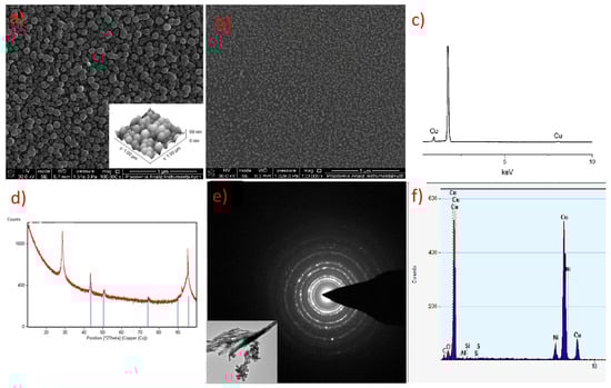 The EDX (SEM analysis) and XRD spectra of the layers showed that they contain metallic copper (Figure 16a,b and Figure 17b,c). The formation of metallic copper during the CVD process was also confirmed by the diffraction patterns and EDX spectra obtained by TEM analysis (Figure 16c and Figure 17d,e). The great advantage of compound (2) is that it was possible to obtain pure copper films from the air-stable copper(II) complex in an argon atmosphere without using an additional reducing agent. However, in the case of complex (3), apart from metallic copper, copper(I) oxide and a small amount of carbon (2.9 at.%) were also detected. In contrast, the layers deposited with the use of [Cu2(NH2tBu)2(µ-O2CRF)4] precursors contained metallic copper and a low content of fluorine (1.5 at.%) [42]. Interestingly, despite the high content of fluorine in compounds (2) and (3), it is not present in the obtained deposits.