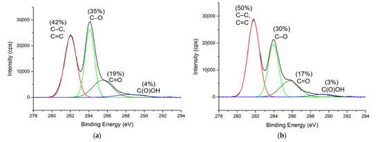 The C1s XPS spectra of GONs and o-SWNTs (Figure 1) were deconvoluted into four gaussian sub-peaks: C–C and C=C (~281.9 eV), C–O (~284.0 eV), C=O (~285.6 eV), and C(O)OH (~288.9 eV) [21,22]. The spectra of GONs and o-SWNTs appear similar, but the ratio of peak height 281.9 eV to 284.0 eV was different between the two cases. The C1s XPS spectrum of o-SWNTs (Figure 1b) has a larger peak at ~281.9 eV and a smaller peak at ~284.0 eV, indicating that the o-SWNTs contained more C–C and C=C functional groups and fewer C–O functional group than the GONs. That is, the o-SWNTs (50% oxidized) were less oxidized than the GONs (58% oxidized).