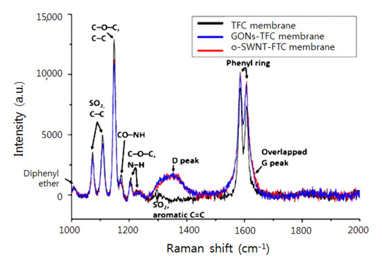 The presence of GONs and o-SWNTs in the PA layer of the membranes was investigated using Raman spectroscopy (Figure 2). The Raman spectrum of the TFC membrane (black line) exhibits typical peaks of PSf and PA [23,24,25,26,27]. The very weak peak at 1007 cm−1 originates from symmetric stretching of diphenyl ether. The two peaks at 1073 and 1108 cm−1 correspond to symmetric and antisymmetric SO2 stretching, respectively, and also C–C stretching. The one strong peak at 1148 cm−1 originates from symmetric C–O–C and C–C stretching, and the overlapping weak peak at 1171 cm−1 corresponds to CO–NH skeletal motion. The weak peak at 1206 cm−1 and the weak broad peak at 1226 cm−1 arose from asymmetric and antisymmetric C–O–C stretching and N–H wagging, respectively, and the very weak broad peak at 1295 cm−1 came from asymmetric SO2 stretching and symmetric aromatic C=C stretching. The two strong peaks at 1585 and 1606 cm−1 correspond to phenyl ring vibrations.