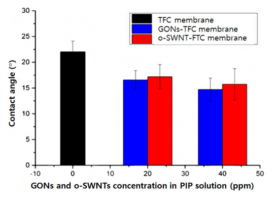 The contact angle of the TFC membrane decreased slightly after embedment of GONs or o-SWNTs (Figure 3) into the PA layer. The contact angle of the GONs-TFC membrane was only marginally smaller than that of the o-SWNT-TFC membrane within the margin of error. In other words, the hydrophilicities of the GONs- and o-SWNT-TFC membranes do not noticeably differ but are higher than that of the TFC membrane.