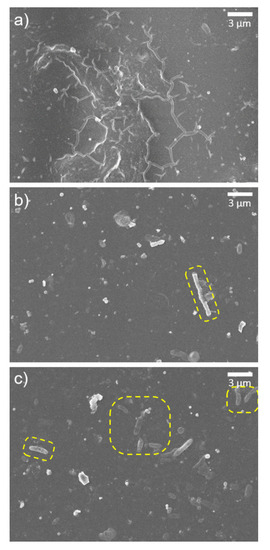After acid treatment, several things that look like GONs and o-SWNTs, or microbes were found on the membrane surface (Figure 6). In detail, the wrinkled pattern was observed on the GONs-TFC membrane because the upper part of the PA layer was degraded (Figure 6a). Such patterns are typical of GONs, whether they are embedded in a PA layer [19] or not [34]. The yellow dashed regions in Figure 6b seem to be rod-shaped o-SWNTs on the surface of the o-SWNT-TFC membrane. The width of the wrinkle and rod are several dozen times thicker than GONs and o-SWNTs, respectively. That could be due to the wrapping of the o-SWNTs by PA. The structure looked like o-SWNTs are thinner, brighter, and less rounded [35], but the microbes are relatively thicker, darker, and more rounded [36].