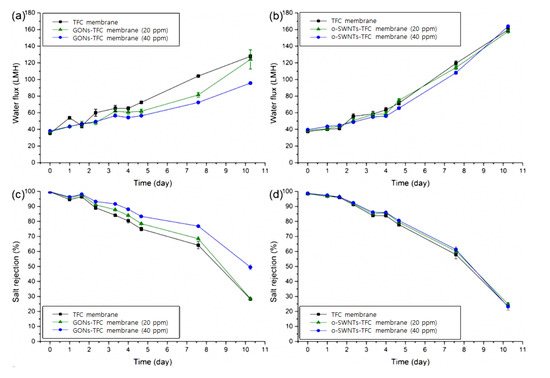 Water flux of (a) GONs- and (b) o-SWNTs-TFC membranes (0, 20, 40 ppm) and salt rejection of (c) GONs- and (d) o-SWNTs-TFC membranes (0, 20, 40 ppm) with a 2000-ppm MgSO4 feed solution. The time in the x-axis represented the time of immersion in sulfuric acid (n = 3).