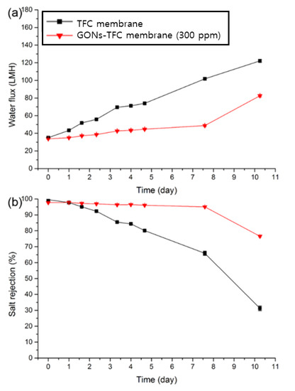 Over time, salt rejection of the TFC membrane decreased with acid treatment, but the decline rate was reduced by the embedment of GONs. At the end of the test, the GONs-TFC membrane (40 ppm) exhibited 21% higher salt rejection than the TFC membrane. This acid resistance might originate from the (physical) barrier effect of GONs and hydrogen bonding between GONs and PA. The barrier effects have been previously reported for chlorine resistance of TFC membranes [19,43,44] and for enhanced acid resistance of TFC membranes coated with another material [13]. In detail, GONs would lie horizontally on the PA layer such as in the case of Langmuir–Blodgett film deposition [45,46], indicating horizontal deposition of films on a substrate when a substrate is pulled out vertically from a solution containing film. In this study, the support layer was pulled out vertically from a PIP solution including GONs. The horizontally arrayed GO nanosheets could act as a physical barrier, protecting the underlying PA against acid solution [19,43]. Moreover, the functional groups of GONs could form hydrogen bonds with the carbonyl groups of PA [47]. Such hydrogen bonding could impede the addition of hydrogen to carbonyl groups, the initiating site of hydrolysis [13]. In addition, the bumps on GONs- and o-SWNT-TFC membranes (Figure 4b–e) might act as a sacrificial layer to further increase their acid resistance [48].
