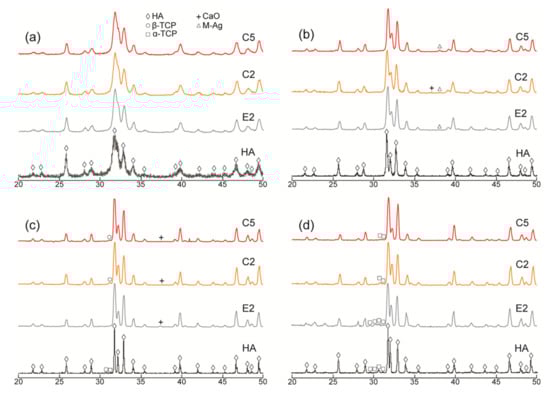 XRD patterns of the Ca-deficient (C2 and C5) AgHAs compared to E2 and pure HA heat-treated at (a) 700 °C, (b) 900 °C, (c) 1100 °C, and (d) 1300 °C. Y-axis: arbitrary unit.