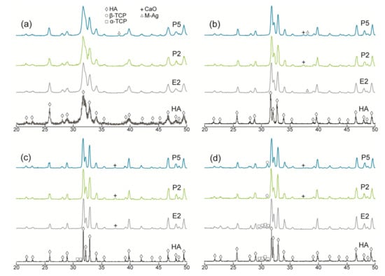 The AgHAs synthesized from the Ca-deficient precursors, namely C2 and C5, showed a partial decomposition in the HA phase forming a slight amount of β-TCP upon heat treatment at 1100 °C [13]. In contrast, the AgHAs synthesized from the P-deficient precursors, namely P2 and P5, stayed mainly stable at 1100 °C, while a slight amount of β-TCP became apparent at 1300 °C. For comparison, HA and E2 were considered, which presented a similar structural decomposition to α-TCP at 1300 °C which is higher than the β→α transformation temperature (around 1140 °C). In this regard, the Ag ion can be considered as a β-TCP stabilizing agent upon incorporation into the HA structure [20], especially for the P-deficient precursors in this study.