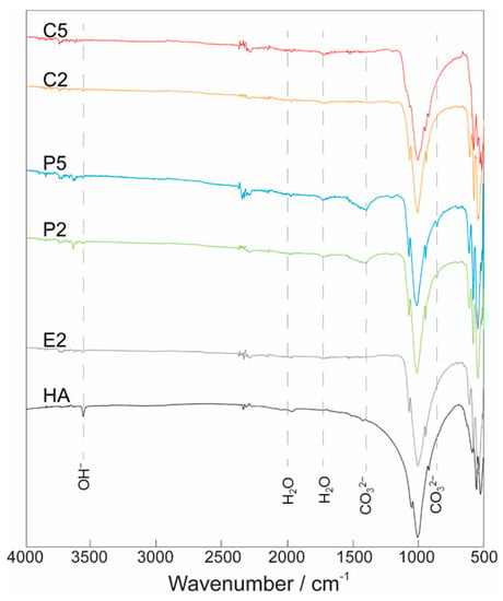 The peaks observed in the range of 1400−1500 cm−1 and 885 cm−1 in the P2 and P5 samples can be attributed to the asymmetric stretching vibration of CO32−, particularly corresponding to B-type carbonate groups that specifically incorporated into the phosphate sites [33]. In contrast, no peak was identified as evidence for the existence of A-type carbonate [34]. In the meantime, the peak of the band at 3570 cm−1 attributed to the stretching vibration of OH− in the HA structure almost completely disappeared from the FTIR spectra of E2, P2, P5, C2, and C5 (Figure 3).