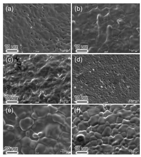 The results from the SEM studies (Figure 4) showed that HA, C2, and C5 possessed a small amount of porosity at 1100 °C, providing evidence for the possible thermal decomposition of the HA main phase, as indicated by the XRD results. The average grain size of these samples was 5.8 µm, 5.3 µm, and 3.3 µm, respectively (Table 2). However, the average grain sizes of E2, P2, and P5, showing no phase decomposition, were 8.6 µm, 10.6 µm, and 6.6 µm, respectively.