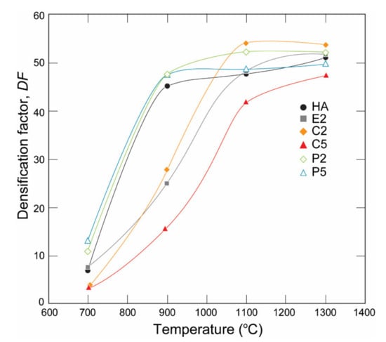 The densification factor (DF) of the samples calculated using Equation (1) is given in Figure 5. The DF values of the samples showed a steep increase with an increase in the heat-treatment temperature from 700 °C to 1100 °C. Apparently, the increase in densification occurred earlier, particularly in P2, and the P5 samples at a lower temperature range and later for E2, C2, and C5 at a higher temperature range. The DF of C2 was the highest among the samples at 1100 °C and 1300 °C. In contrast, the DF of C5 was always the smallest at all temperatures, which can be related to the dehydration of the OH− group [31] and a subsequent phase decomposition during the heat treatment detected with XRD analysis, which releases H2O as a reaction product as discussed by Ou et al. [35] and resulted in differences in the thermal expansion of HA and β-TCP [36]. This result can be related to the porosities observed in the SEM micrograph (Figure 4).