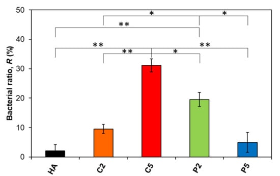 The bactericidal ratios of the samples of interest in this study as calculated with Equation (2) are given in Figure 6. The descending order in bactericidal ratios from this study was C5 > P2 > C2 > P5 > HA, while the control group reached 8 × 108 CFU mL−1 bacteria concentration after 6 h of incubation, which is quite a high bacteria concentration considering that clinical infection occurs at about a 1 × 105 CFU mL−1 bacteria concentration.