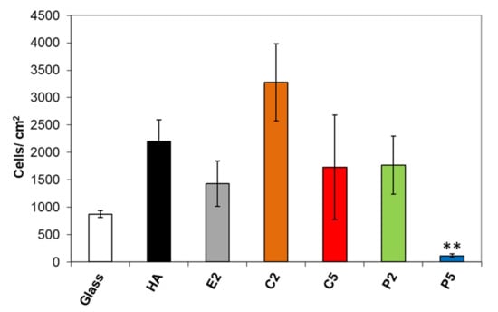 Results of osteoblast adhesion to the samples after 4 h are shown in Figure 7. The difference in osteoblast adhesion on the AgHA was statistically insignificant except for P5 compared to that on pure HA. The mean value of viable osteoblasts was the highest for C2, being better than pure HA with a factor of 1.5. In contrast, osteoblast adhesion exhibited a considerable decrease for C5, which is not surprising since it had a higher Ag content than C2. On the other hand, the mean value of viable osteoblasts on the P2 sample was interestingly lower than on C2 despite its lower Ag content. More interestingly, the number of viable cells decreased on the P5 samples, being a much lower value than that on C5 with a factor of about 15.6, in spite of its slightly lower Ag content.