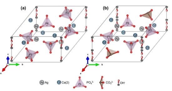 Representations of AgHA structure models synthesized with (a) Ca-deficient and (b) P-deficient precursors.