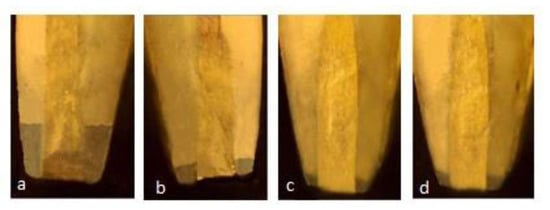 Stereomicroscopic images of leakage in different group at 15 days (a) GIC (1.23 mm) (b) Proroot MTA (0.45 mm) (c) Neo MTA plus (0.08 mm) (d) BIODENTINE (0.10 mm).