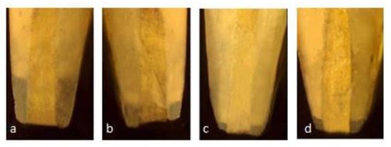 Each specimen was sectioned transversely in the cervical area to separate the crown from the root, using a diamond disc with a water spray keeping a standard length of the remaining root at 12 mm, to maintain standardization among samples. The working length was established at 1 mm short of the anatomical apex. Biomechanical preparation was done using hand ProTaper and obturation with gutta-percha and zinc oxide eugenol sealer. The coronal access cavity was filled using GIC. This was followed by resection of each sample apically at 90 degrees to the long axis of the root, using a crosscut fissure bur, removing 3 mm of the apex. A 3 mm deep retrograde cavity was prepared using an inverted cone diamond bur, following the manufacturer’s instructions. Samples were kept in the buffering solution at 37 °C for the recommended evaluation period. The specimens were suspended in 1% methylene blue for 24 h prior to the analysis. Following these steps, the samples were rinsed with running water for 15 min. Clear acrylic blocks were made to stabilize the samples. Each specimen was sectioned transversely in the cervical area, maintaining a standard root length of 12 mm for standardization purposes. Then, these specimens were examined under a stereomicroscope using 2× magnification. (Figure 1 and Figure 2).