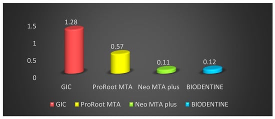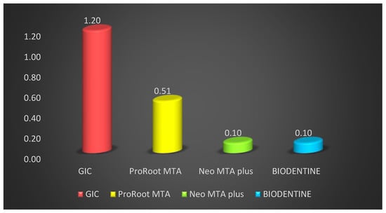Various studies show that the minor variation in the lower microleakage values of MTA might be ascribed to its superior marginal sealing ability, resulting from its hydrophilic properties and formations of an interfacial layer between the material and dentin. This layer decreases the chances of marginal percolation and offers encouraging clinical success over the longer term [19]. Bioactive materials have been studied for their biocompatibility and have shown release of varying levels of zirconium, calcium, tungsten and silicone [20]. It has been shown in previous studies that NeoMTA Plus and BIODENTINE demonstrate suitable cytocompatibility with the human dental pulp cells as well as having particularly good cell migration rates [21,22]. In terms of dental bridge formation and maintenance of a vital pulp, both NeoMTA Plus and BIODENTINE have been found to be exceptionally reliable. Most of these materials differ in terms of ease of handling, binding quality, quality of the dentin bridge and protocols, which must be studied extensively to obtain further details. There are various factors responsible for micro-leakage such as: dimensional stability of the material, response to tissue fluids, adaptation and handling and electro-chemical nature. The present study is in vitro in nature and the result cannot be directly applied to the patients. However, the study opens the path for further research to study not only the sealing ability but also other related physical properties, as well as critical manipulative steps.
