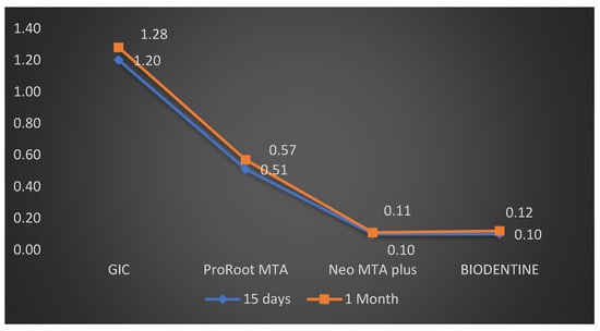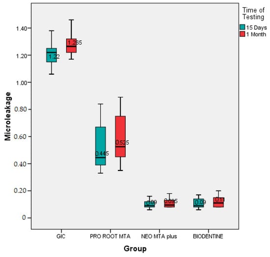 The intra group comparison between fifteen days and one month was confirmed with the help of paired t-test. Among the GIC group, the dye penetration at one month was 1.28 ± 0.08 mm, which was not significantly greater than fifteen days (1.20 ± 0.10 mm), with p value = 0.04 (Table 3). The result for ProRoot MTA showed that the dye penetration at one month was 0.57 ± 0.18 mm but it was not significantly greater than fifteen days (0.53 ± 0.16 mm), with p value = 0.67 (Table 3). The intragroup comparison for Neo MTA showed that the dye penetration at one month was 0.11 ± 0.03 mm, which was slightly less compared to fifteen days (0.10 ± 0.03 mm), with p value = 0.91. The intragroup comparison for BIODENTINE showed that the dye penetration at one month (0.12 ± 0.04 mm) which was slightly less as compared to seven days (0.10 ± 0.04 mm), with p value = 0.89 (Table 4) (Figure 5). A box-and-whisker plot was also designed to evaluate whether the results were skewed, and it was observed that the highest and lowest reported microleakage from the GIC group was higher than that seen in the other groups. Also, the lowest median microleakage was seen in the Neo MTA plus group compared to the others. This confirmed the findings from the other tests that there was significant microleakage in the GIC group over fifteen days as well as one month (Figure 6).