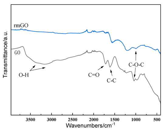 Figure 1 shows the Fourier transform infrared spectroscopy (FTIR) results of the GO and mrGO. There were residual functional groups C-O-C in mrGO. Aluminum and mrGO-Cu powders were mixed for 1 h in alcohol solvent. Then, the mixed powder was vacuum dried for 12 h. The dried mixed powder was ball milled for another 30 min, and the ball-to-battery ratio was 7:1. Then, the homogeneous mixture was placed into aluminum tubes (48 mm in diameter), headed to 500 °C and incubated for 3 h. After that, the mixed powders were rolled with a deformation of 60–70% to obtain the mrGo-Cu/Al composite sheets. Finally, the composites were exposed by removing the surface aluminum layers. The pure aluminum specimen was prepared in the same way.