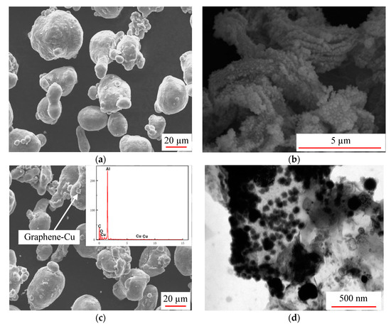 Figure 3c is the morphology of mixed composite powder of pure Al with 2% content of mrGO-Cu, showing that the aluminum powder was evenly dispersed, but a small amount of aluminum powder agglomerated. Some substances were found on the surface of the aluminum powder, which contains C, Cu and Al elements (inset in