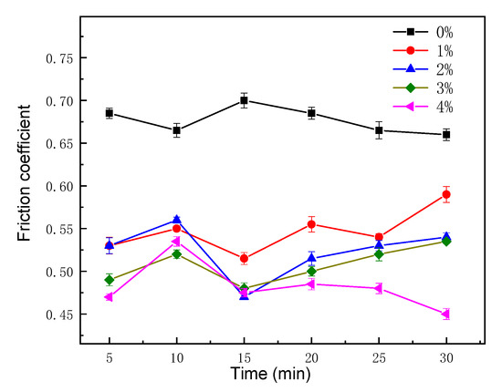 Figure 5. Compared with the pure aluminum substrate, the friction coefficient of aluminum composites is decreased with the addition of mrGO-Cu content. It could be seen that the friction coefficient of mrGO-Cu/Al composites obviously decreased when the treatment time for wearing was 25 min. Moreover, 1% content of mrGO-Cu can cause significantly dropping of the friction coefficient from 0.66 to 0.55 for the composites. When the content of mrGO-Cu was up to 4%, the friction coefficient of mrGO-Cu/Al composites reached 0.47 with a reduction of 28.8% compared to friction coefficient of pure aluminum matrix. The regular pattern was caused by the graphene lubrication film formed on the interface of friction pair. On one hand, the graphene lubrication film could change the mode from unlubrication friction to boundary friction. On the other hand, it could easily access the cavity of composites and decrease the roughness of friction surface, since graphene has a thin thickness. Therefore, there was a tendency towards decrease in the friction coefficient.
