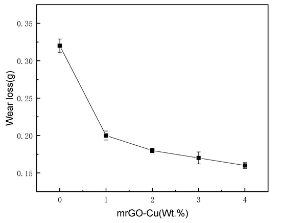 Figure 6. It could be found that the wear loss of mrGO-Cu/Al composites obviously decreased with the addition of mrGO-Cu. When the content of mrGO-Cu was up to 4%, the value of wear loss of composites (0.17) is the lowest, which is only 50% compared to that of pure aluminum matrix (0.34). The mrGO-Cu played a dispersion strengthening effect in the matrix alloy of the composite material. As the content of mrGO-Cu increased, the grain size of the composite material was refined and the hardness increased, the wear resistance of the material was improved. The wear loss of mrGO-Cu/Al composites decreased with the addition of mRGO-Cu may be interpreted as mrGO-Cu could form a lubricating film, and could hinder plastic flow of mrGO–Cu/Al composites, hence reducing plastic deformation and forming smaller scales flakes.