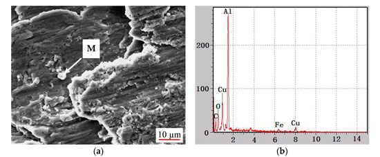 Figure 7) were conducted on the worn surface of the mrGO-Cu/Al composites with 2 wt.% mrGO-Cu. It can be seen that the worn surface consists of Al, oxygen and copper elements. Research has shown that Al