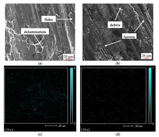 Figure 8b, wide furrows and some debris can be found on the wear surface, indicating that although mrGO-Cu can be used as a lubricating film. However, the multi-graphite is modified by copper, both Cu and CuO, as micro-abrasive grains, could cut the soft Al substrate, and contributed to aggravating abrasive wear. At this stage, the abrasion mechanism was mainly abrasive wear.