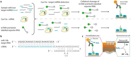 - Bruch, R.; Baaske, J.; Chatelle, C.; Meirich, M.; Madlener, S.; Weber, W.; Dincer, C.; Urban, G. CRISPR/Cas13a-powered electro-chemical microfluidic biosensor for nucleic acid amplification-free miRNA diagnostics. Adv Mater. 2019, 31, 1905311. [Google Scholar] [CrossRef] [PubMed]