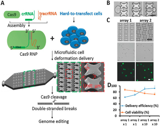 - Han, X.; Liu, Z.; Ma, Y.; Zhang, K.; Qin, L. Cas9 Ribonucleoprotein Delivery via Microfluidic Cell-Deformation Chip for Human T-Cell Genome Editing and Immunotherapy. Adv. Biosyst. 2017, 1. [Google Scholar] [CrossRef] [PubMed]