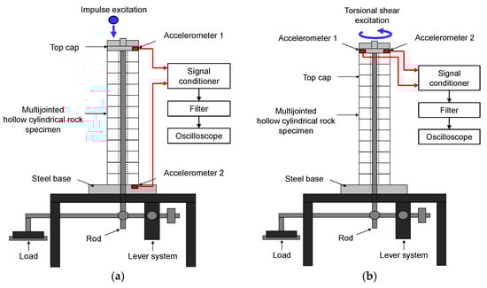 The QSRC test setup was used to measure long-wavelength longitudinal and shear elastic wave propagations in jointed rock specimens. The QSRC test uses quasi-static elastic deformations to generate longitudinal and torsional shear excitations in a jointed rock mass specimen to measure the long-wavelength longitudinal and shear velocities, as shown in Figure 1. Twelve hollow cylindrical rock discs were stacked to simulate jointed rock columns in equivalent continuum. Previous studies noted that nine or more discs are required to avoid Brillouin dispersion and to achieve long-wavelength propagation in a stacked rock column [19]. The rock specimens were placed on a high-impedance steel base to simulate fixed-free boundary conditions. An aluminum top cap and a loading rod were placed on top of the specimen for vertical loading. The loading rod was connected to a lever system that multiplies the load applied on the specimen by a factor of 10. Two accelerometers were used to measure the longitudinal and shear wave velocities. For longitudinal wave measurements, the accelerometers were installed at the top and bottom of the specimen. Longitudinal excitation was simulated by dropping a steel ball bearing onto the top of the specimen. The longitudinal wave velocity was calculated using the point-source travel-time method: