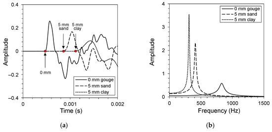 Data analysis of long-wavelength velocity for jointed rock specimens with different gouge fill conditions subjected to 250 kPa normal stress. (a) Time-domain data obtained from longitudinal QSRC tests. The arrival time of each time-domain signal is highlighted using red dots and arrows. (b) Frequency-domain data obtained from torsional shear QSRC tests.
