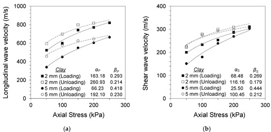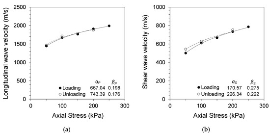 where α is the wave velocity at a 1 kPa confining stress, and the β exponent is the stress sensitivity. The subscripts P and S represent the longitudinal and shear wave velocities, respectively. Figure 4, Figure 5 and Figure 6 present the changes in longitudinal and shear wave velocities for different soil gouge fill conditions. The α factors and β exponents during loading and unloading are also listed. The longitudinal and shear wave velocities increased with increased axial stress for all tested specimens. Sand and clay gouge fill specimens displayed lower wave velocities compared with jointed rock specimens having clean joints for all tested gouge thicknesses and stress levels. This phenomenon is consistent with previous studies, where gouge-filled joints displayed lower stiffness compared with clean joints, making them more likely to be the weakest points in the jointed rock mass [25,26,27].