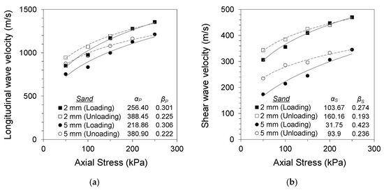 Specimen with Jumunjin sand gouge (2, 5 mm): (a) longitudinal wave velocity against normal stress; (b) shear wave velocity against normal stress.