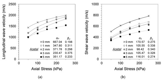 Specimen with acetal gouge (1, 2, 3, and 5 mm): (a) longitudinal wave velocity against normal stress; (b) shear wave velocity against normal stress.