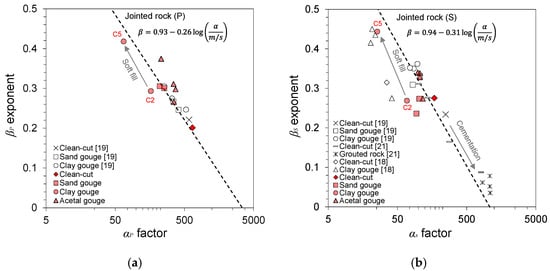 α and β parameters for the velocity–stress power relationship for different gouge fill materials and fill thicknesses. The trend line for jointed rock specimens was adopted from Cha et al. (2009) [19] and Cha et al. (2014) [30]. (a) VP parameters; (b) VS parameters.