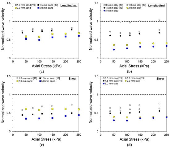 The gouge fill thickness is often measured in the field for rock mass classification, such as the joint alteration number Ja in the Q-system [31]. However, the use of the absolute gouge fill thickness as a quantitative indicator of joint properties is questionable and remains uncertain. The wave velocity of sand and clay gouge fill specimens was compared with previous QSRC test results on similar soil gouge fill specimens [19], as shown in Figure 9. The wave velocity of the clean-cut joint specimen for each axial stress level was used to normalize the wave velocity of sand and clay gouge fill specimens obtained during loading.