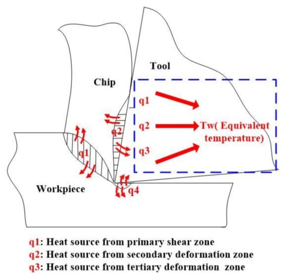 In the cutting process, heat generation occurs at the shear plane by primary deformation, tool–chip interface, and tool–workpiece interface by friction, as shown in Figure 1 [18]. The generated heat is concentrated on the region around the cutting edge. However, the value of heat flux on the rake face is difficult to obtain through the measurement or calculation method owing to the very small space of the three heat sources and very short cutting time. For simplicity, it is assumed that there is no temperature gradient in the rake face, and there is no heat source and no heat generation in the tool body. The generated heat can be taken as one equivalent constant temperature acted on the rake face of coated tool in one-dimensional heat conduction, as shown in Figure 1.