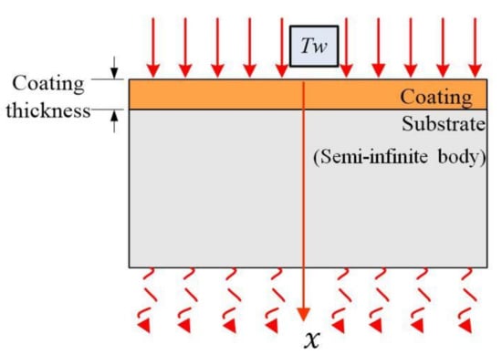 The coating thickness of the mono-layer coated tools is generally very thin, between 1 and 8 μm [19] When the tool cuts into the work piece, the tool coating is subjected to strong instantaneous thermal shock. With the increase of cutting time, the transient degree gradually weakens, and finally transits to steady-state heat conduction. The coated tool substrate is sufficiently large compared with mono-layer coating and can then be considered to be a semi-infinite body. Figure 2 shows a schematic of heat conduction model for a one-dimensional coated tool. For the heat conduction calculation, the following assumptions were used: