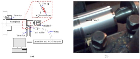 In order to verify the analysis model, thermocouples are used to measure the cutting temperature of coated tools in the cutting process. The work piece material used in the turning experiment is H13 hardened steel. A general overview of the experimental setup is shown in Figure 3a. Photos of the experimental set–up are shown in Figure 3b. The workpiece employed in this experiment was a cylindrical bar with 300 mm length and 70 mm external diameter. The cutting speeds were vc = 35.9 m/min, 56.1 m/min, 89.2 m/min, 110.7 m/min, 197.8 m/min, and 244.4 m/min, respectively. The feed rate was f = 0.2 mm/rev, while the depth of cut was ap = 0.2 mm. The machining operation was then performed with a constant chip section and a constant cutting speed.