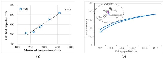 The temperature distribution of TiN-coated tools: (a) relationship between measured and calculated values and (b) measured and calculated values versus cutting speed.
