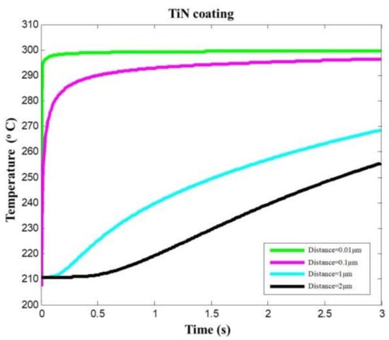 Temperature prediction in TiN coating changing over distance from coating surface.