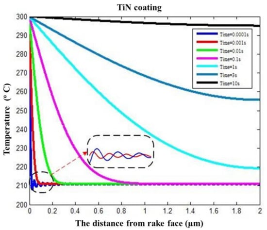 According to the transient heat conduction model, the cutting temperatures of TiN-coated tools are calculated, as shown in Figure 6 and Figure 7. In Figure 6, in 0.5 s cutting time, the temperature of coating surface increases from the initial temperature 20 °C to the assumed equivalent temperature of 300 °C (0.01 μm from the coating surface); the temperature of the coating–substrate interface increases from 20 °C to close to 210 °C (2 μm from the coating surface). Different positions inside the coating have different temperature values at the same time. When the cutting time of 2 s is achieved, the coating surface temperature (0.01 μm from the coating surface) is higher than the coating body temperature (0.1 μm from the coating surface). At the same cutting time, the farther the distance from the coating surface, the lower the temperature. This indicates that the cutting heat conduction is a finite velocity heat conduction.