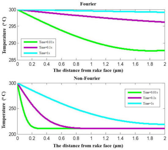 It can be observed from Figure 8 that the temperatures predicted by Fourier heat conduction and non-Fourier heat conduction at the same cutting time and the identical location are in great difference. The temperature calculated with Fourier heat conduction does not present a thermal disturbance at intensity transient heat conduction. It shows a reduction process starting from the boundary temperature of 300 °C. The temperature calculated with non-Fourier heat conduction has a rapid reduction in unsteady-state heat conduction. Then, the temperature goes through a fluctuation change process. With the reduction of the transient degree, the fluctuation changes disappear gradually and present a temperature reduction.
