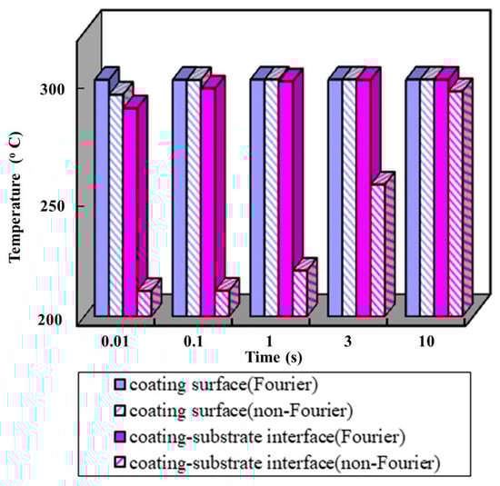 The temperatures at coating surface and coating–substrate interface calculated with non-Fourier heat conduction and Fourier heat conduction are shown in Figure 9, respectively. The predicted temperature at the coating–substrate interface is very different between the two models. When the cutting time is 0.01 s, the calculated temperature difference between the two models is 77.1 °C. When the cutting time is 10 s, the calculated temperature difference between with the two models is 4.9 °C. When the cutting time is long enough and heat conduction is at the steady-state, the temperature tends to stabilize. The cutting heat conducts through the thin film coating on the tool surface to the inside of the tool can be described a transient heat conduction with a finite velocity.