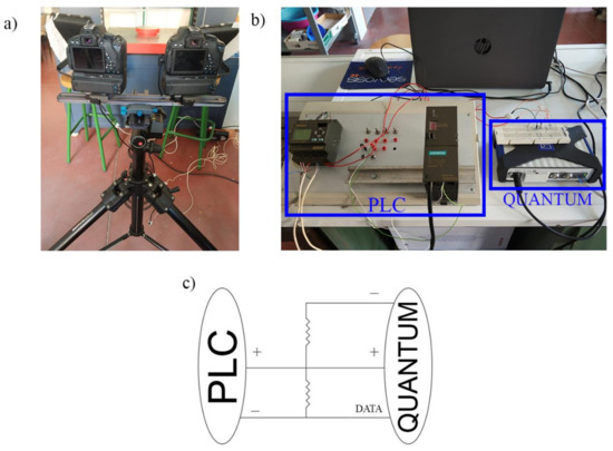 Data acquisition prototype: (a) platform of cameras and lighting units; (b) PLC and Quantum connections; and (c) single-line connection diagram.