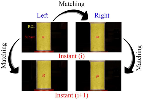 In order to carry out the matching procedure, it is necessary to divide the Region of Interest (ROI) into smaller areas called subsets (Figure 4). The degree of similarity between the subsets of each image is evaluated using the Zero mean Normalized Cross-Correlation (ZNCC) criterion [52]. This correlation criterion is insensitive to the offset and linear scale in illumination lighting, offering the most robust noise-proof performance (Equation (3)).