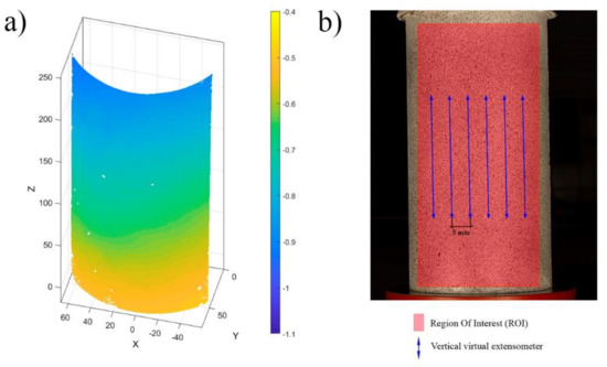 Once the correlation process has been carried out, it is possible to perform the three-dimensional reconstruction of the corresponding points, thus obtaining a point cloud associated with the centres of the subsets placed within the ROI. To this end, the DLT parameters (L1–L11) obtained in the orientation process were used along with image coordinates (xp, yp) of the points obtained from DIC. In this way, the real coordinates of each of the points (X, Y, Z) can be calculated by means of Equation (4), following a least-square strategy. Since the external orientation was performed with a calibration object with known 3D coordinates, the X, Y, Z coordinates are obtained in the global coordinate system for all cameras.