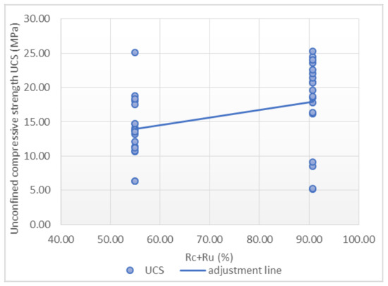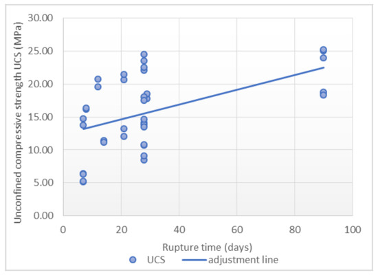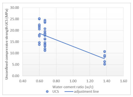 On the one hand, the adjustment obtained using MLR demonstrates that the variables’ rupture time, water-cement ratio and Rc + Ru are able to predict the UCS with a determination coefficient of 0.848 within the validity range, with a standard error of 0.137. The coefficients showed that the w/c ratio has the greatest influence on compressive strength.