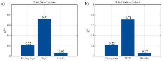 Figure 16 indicates that in the case of CDWRCer, the compressive strength of the concrete is the most relevant parameter in the peak strain prediction model. This mechanical property explains 58% of the total variance, which agrees with other studies in which it is stated that strength is the main variable in this type of model [23,56]. The other two input parameters have a similar influence in the results, 24% corresponding to the curing age and 18% corresponding to water-cement ratio. The great similarity between the first and the total Sobol’indices highlights the absence of a second-order effect.