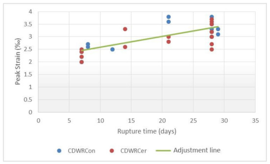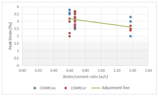 Together with the strength values, it is often very useful to know the maximum strain associated with concretes. In this sense, Eurocode 2 [24] provides an expression that allows us to determine the peak strain as a function of the characteristic strength of concrete and that can be used to predict the strain based on the strengths estimated from the curves of hardening. This expression has been adjusted by González-Fonteboa et al. [25] for different substitution percentages of coarse recycled aggregates, but does not take into account the total substitution of coarse and fine aggregates.