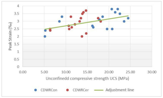 This section describes the strategy used for fitting both predictive models: (i) the predictive model for the unconfined compressive strength (UCS); and (ii) the predictive model for the maximum strain. As stated in the Introduction, the DIC approach is an added value in terms of the possibility of analysing the heterogeneous behaviour of the material and studying the maximum strains in the closest area to failure. This advantage allows us to establish a model to predict peak strain more precisely from the compressive strength of the concrete studied.