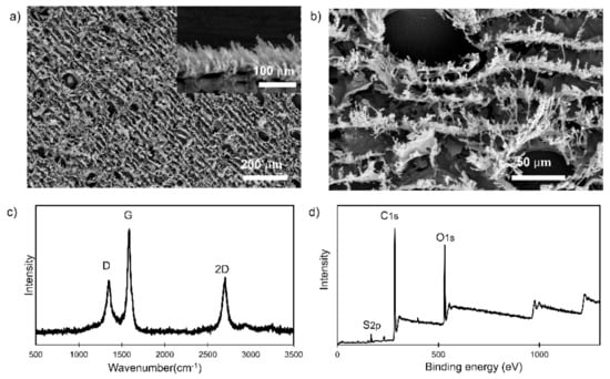 (a) Scanning electron microscopy (SEM) image of an laser-induced graphene (LIG) filter at low resolution (Inset: Cross-sectional SEM image of an LIG filter); (b) SEM image of an LIG filter at high resolution (Scale: 50 µm); (c) Raman spectrum for an LIG filter; (d) X-ray photoelectron spectroscopy (XPS) survey for an LIG filter.